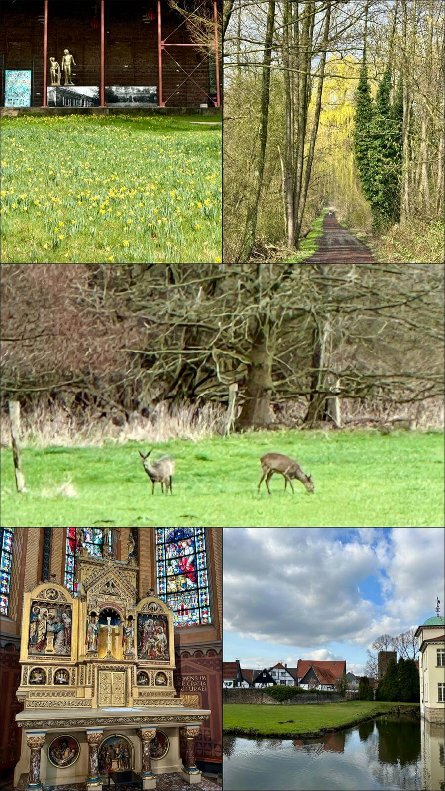 Auf einer Wiese am Holzbach tummelten sich Rehe. Über den Vierhöfeweg gelangten wir zur Buerer Straße, die durch den Golfplatz zum Schloss Westerholt führt.